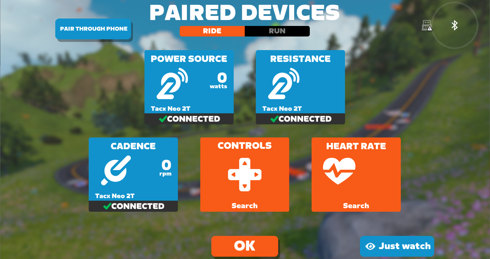 Pairing your Garmin Tacx Neo 2T with Zwift is a breeze. After starting up, Zwift will present the pairing screen, the smart trainer can be selected to pair for power and cadence data, as well as resistance controller.